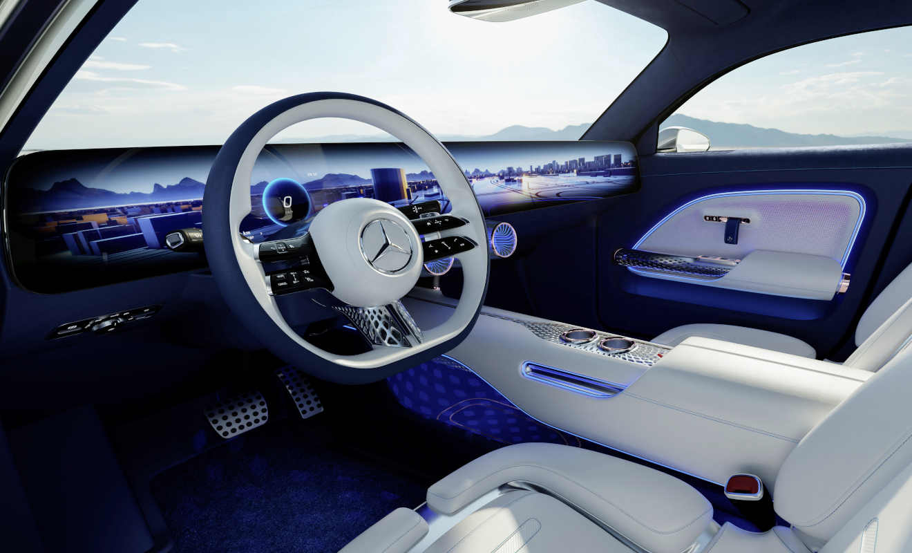 Mehr Informationen gibt Mercedes zum Innenraum. Der ist auffallend puristisch und luftig-leicht gestaltet, bietet als Hingucker einen Bildschirm über die komplette Cockpitbreite. Ähnliches gibt und gab es auch bei anderen Herstellern, die Stuttgarter versprechen aber erstmals ein komplett nahtloses Exemplar. Die Darstellung soll sich spontan an die Bedürfnisse der Insassen anpassen und unter anderem einen virtuellen Avatar bieten, der als Mittler zwischen Mensch und Maschine dient. Bei der Wahl der Interieur-Materialien wurde viel Wert auf Nachhaltigkeit gelegt, unter anderem gibt es eine aus Pilzen hergestellte Leder-Alternative sowie Teppiche aus Bambusfaser.